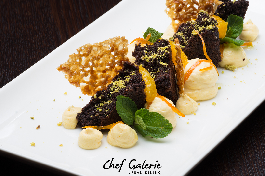 Pandispan de ciocolata servit cu mousse de portocale – 110 g